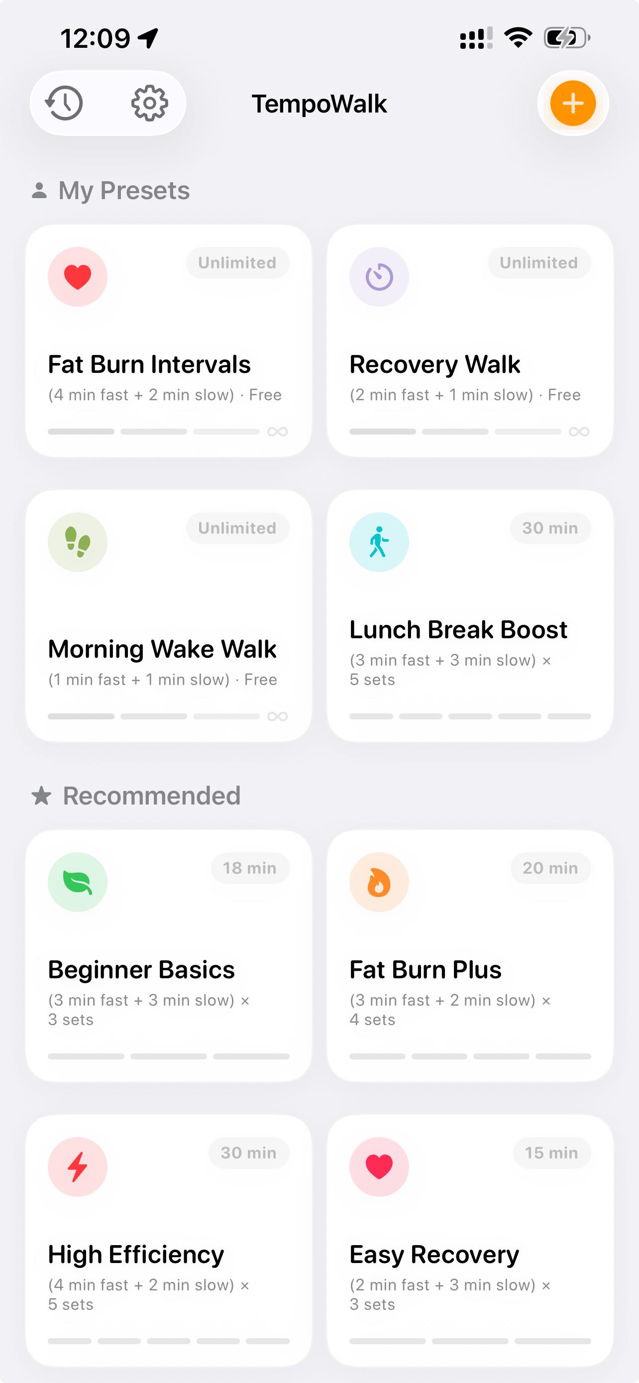 TempoWalk combines smart interval timing with GPS tracking to make every walk count. Simple, powerful, always running.
